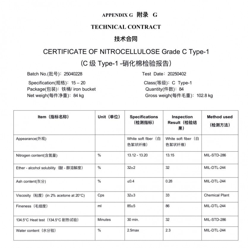 We are reaching out to formally request a quotation for the supply of Nitrocellulose Grade C Type-1 as per the attached technical specifications and inspection certificate. This material is intended for military application, and all relevant procurement protocols and documentation can be provided upon request.